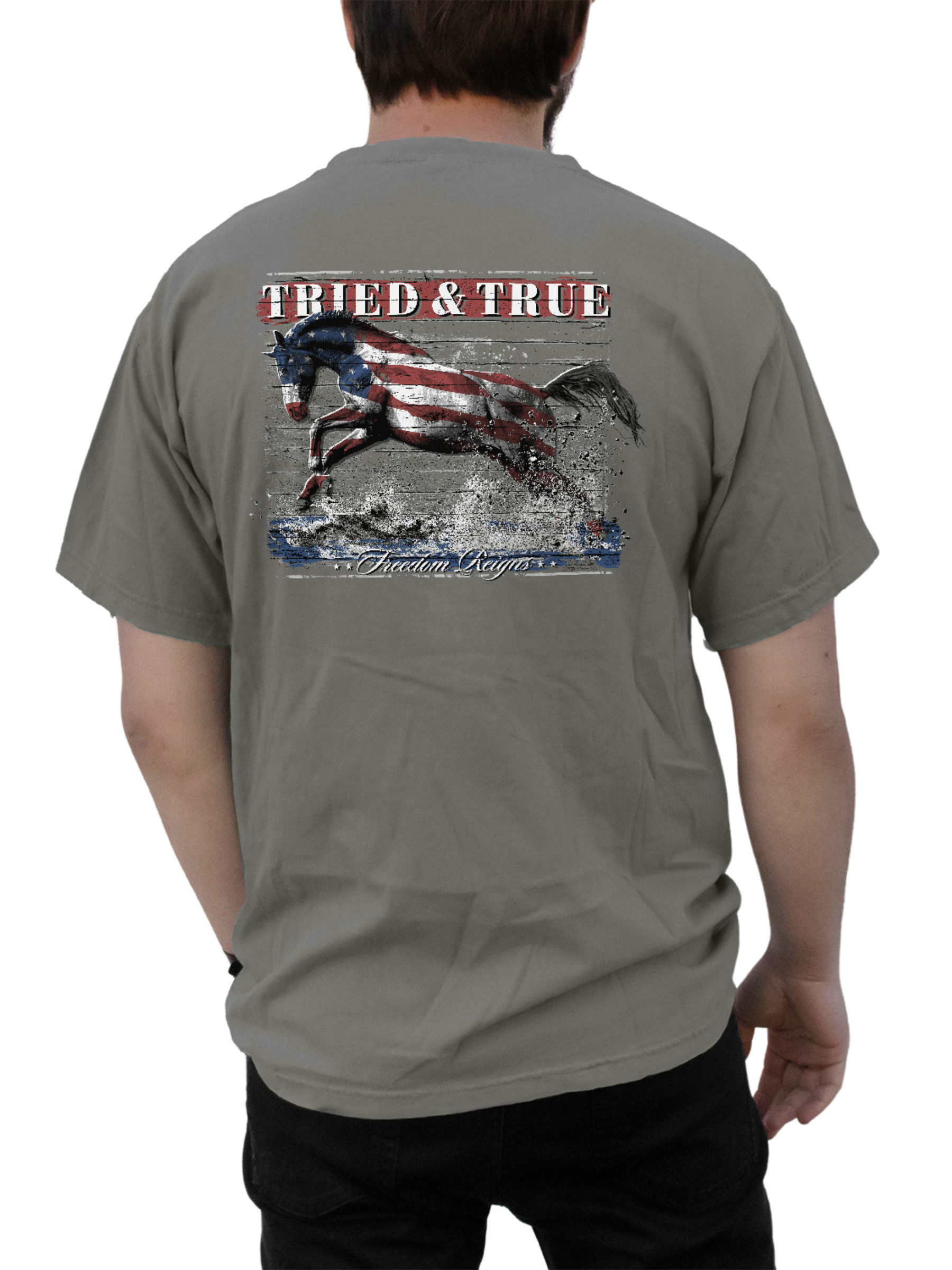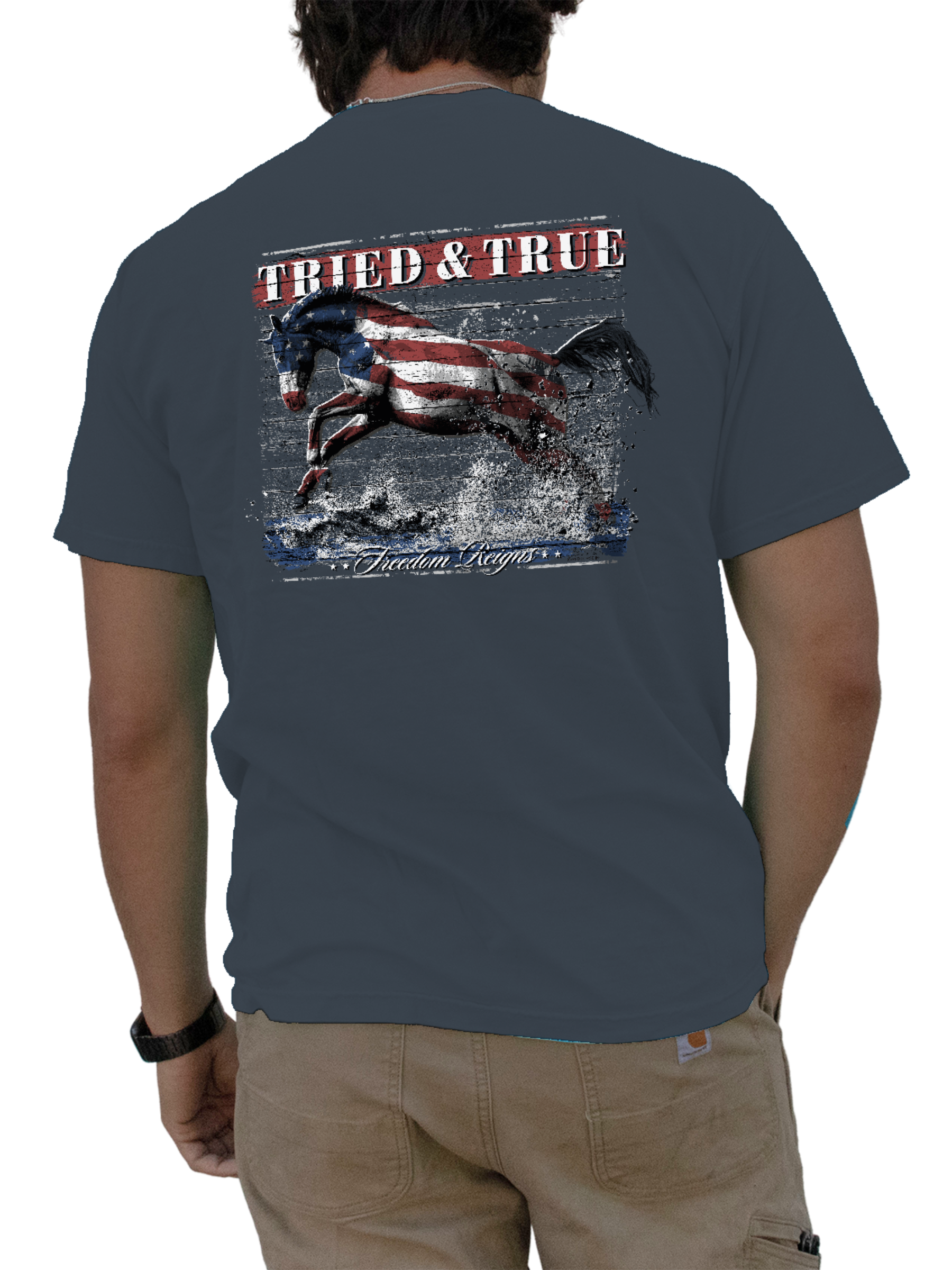 The red, white, and blue stallion of the Tried & True–American Bronco tee doesn’t need an explanation. This vivid image is screened on a super-soft and equally durable made from ring-spun cotton with the Tried and True logo on the front chest. If you know someone who’s got a taste for Blue Collar, Patriotic shirts, then this is something that they’ll definitely love.