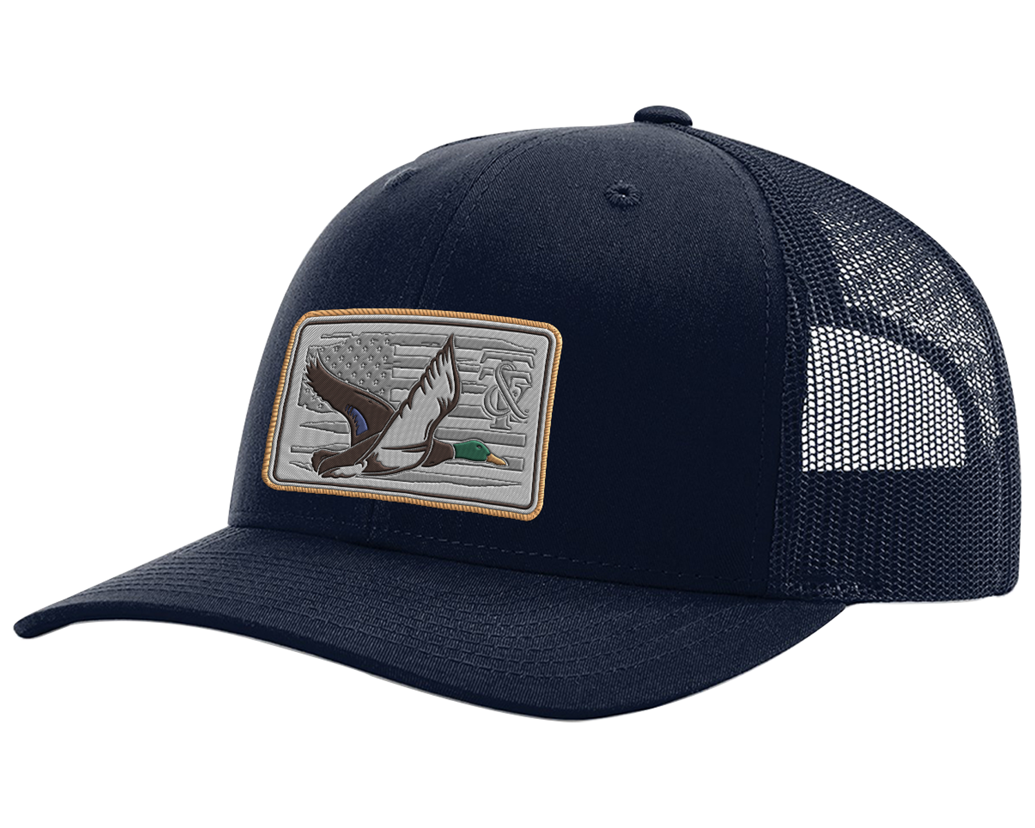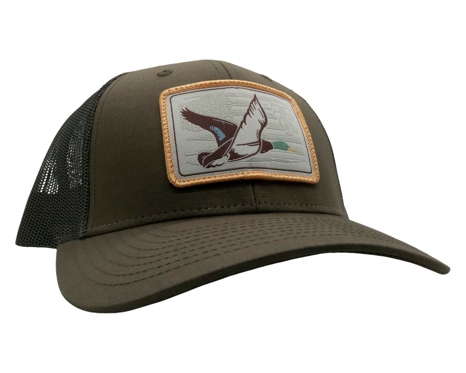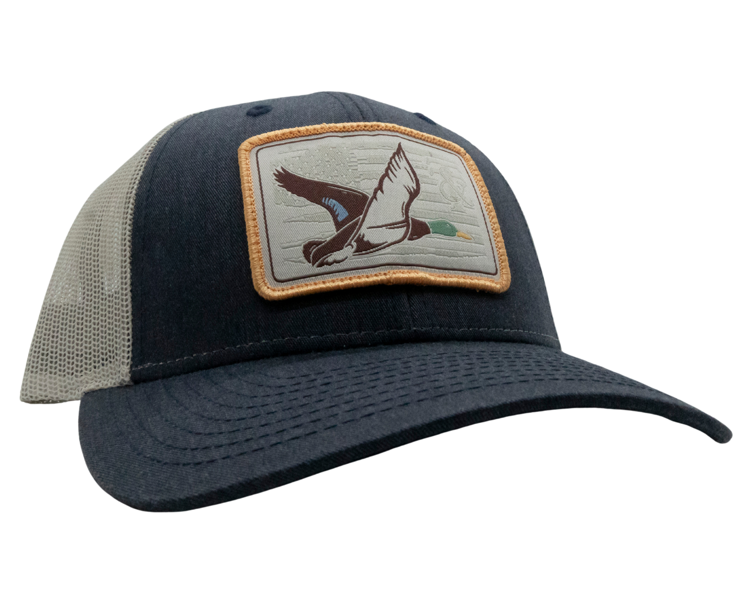 This woven patch has a stylized mallard duck on top of a monochrome American flag.