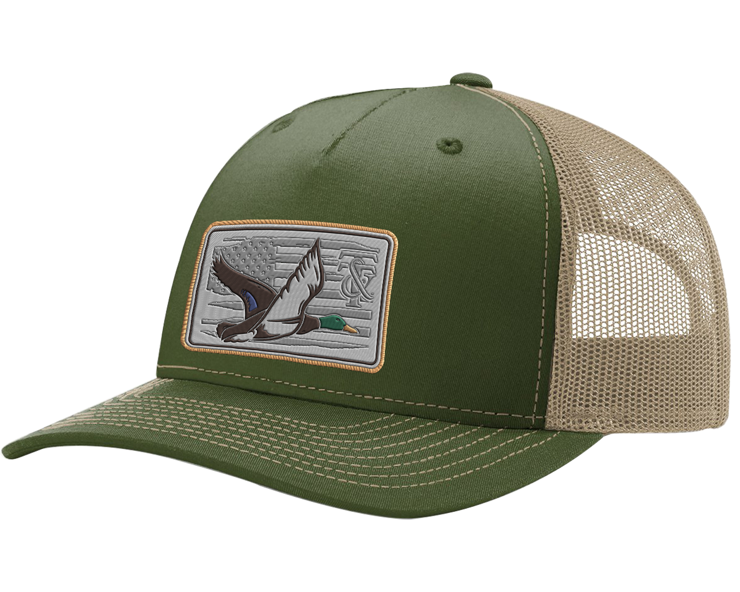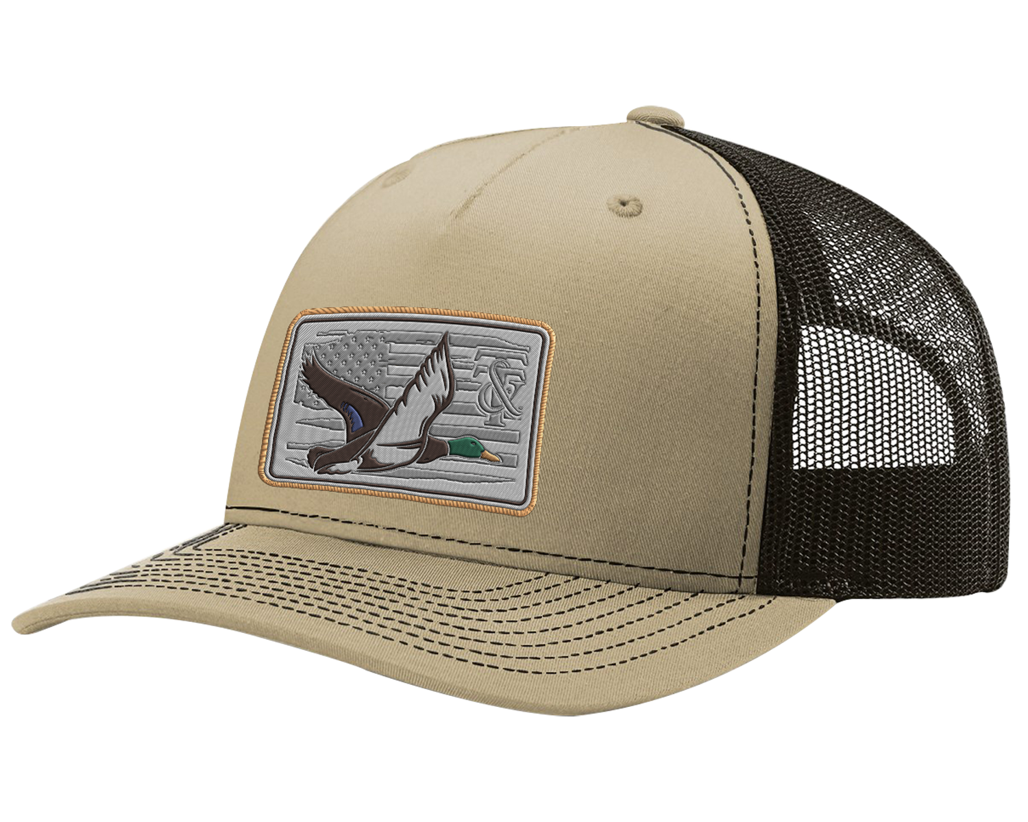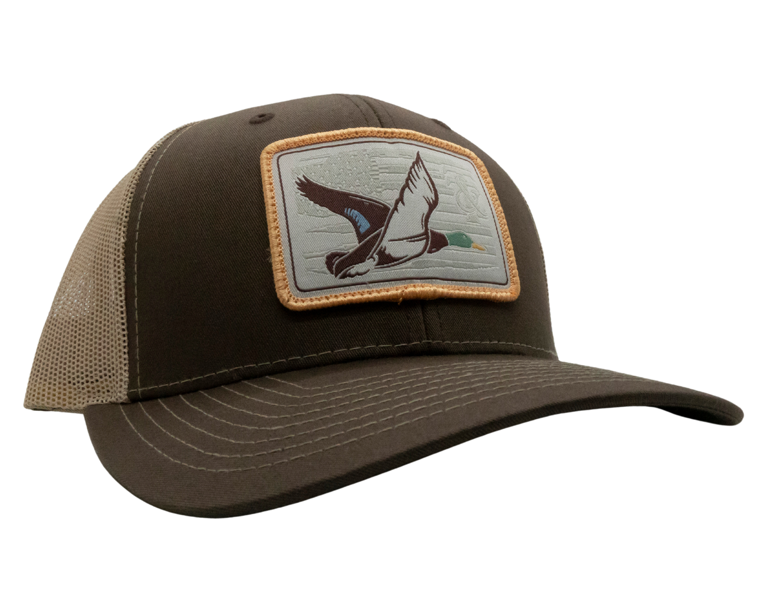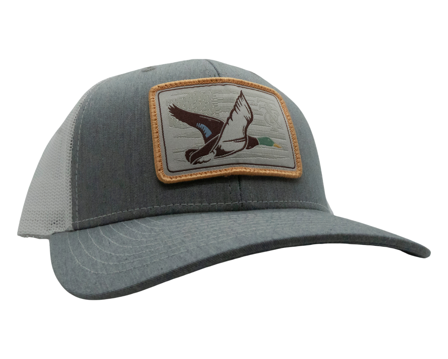 This woven patch has a stylized mallard duck on top of a monochrome American flag.