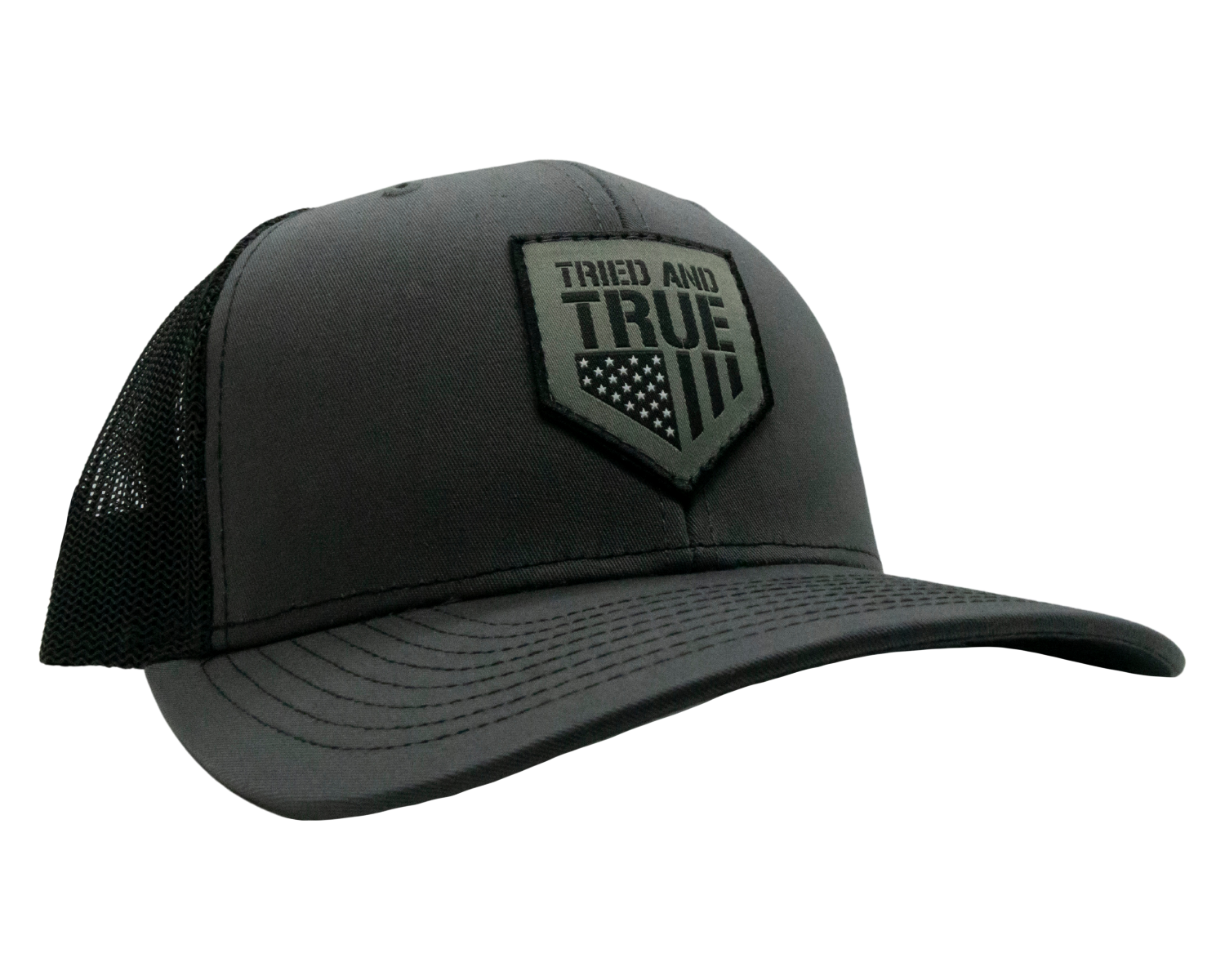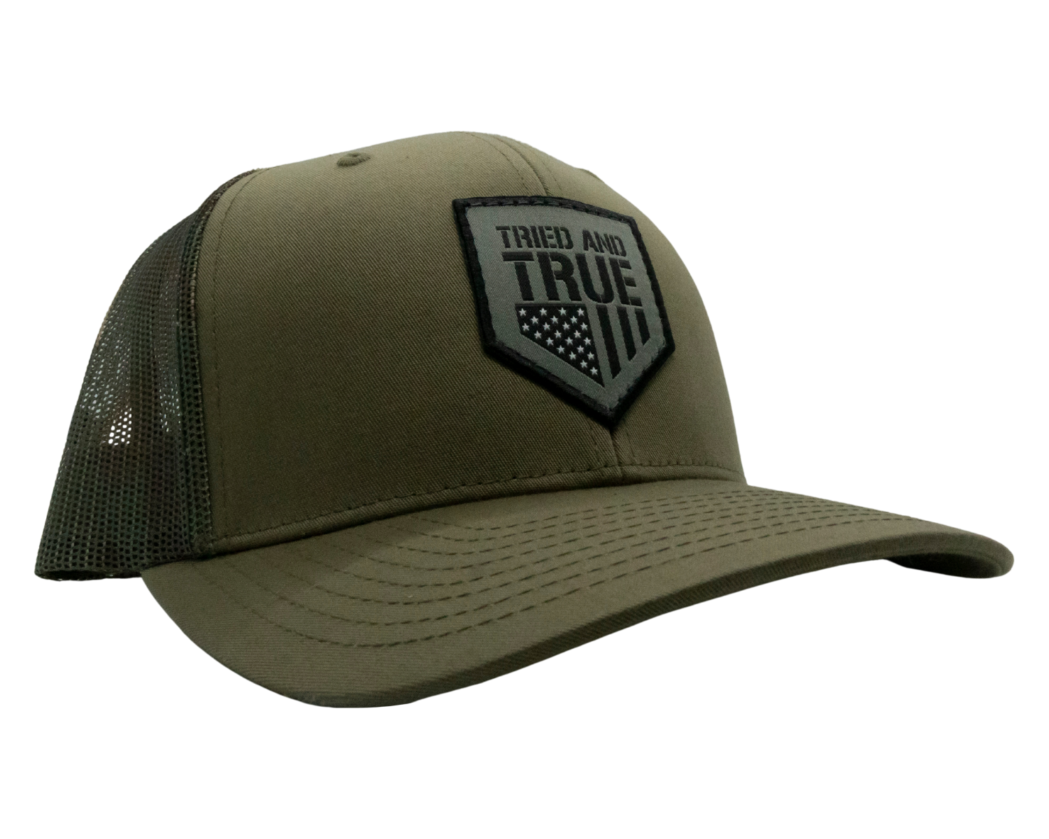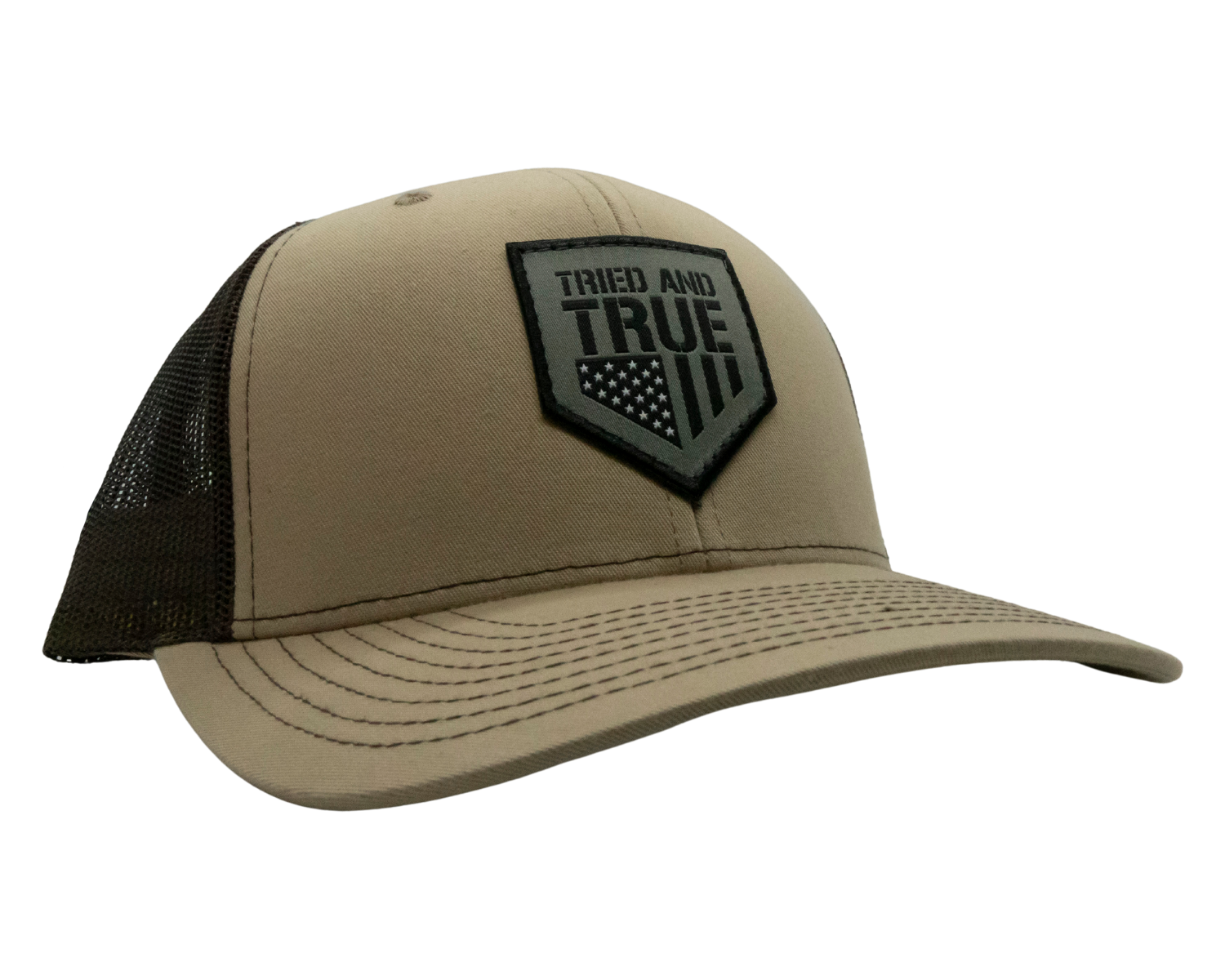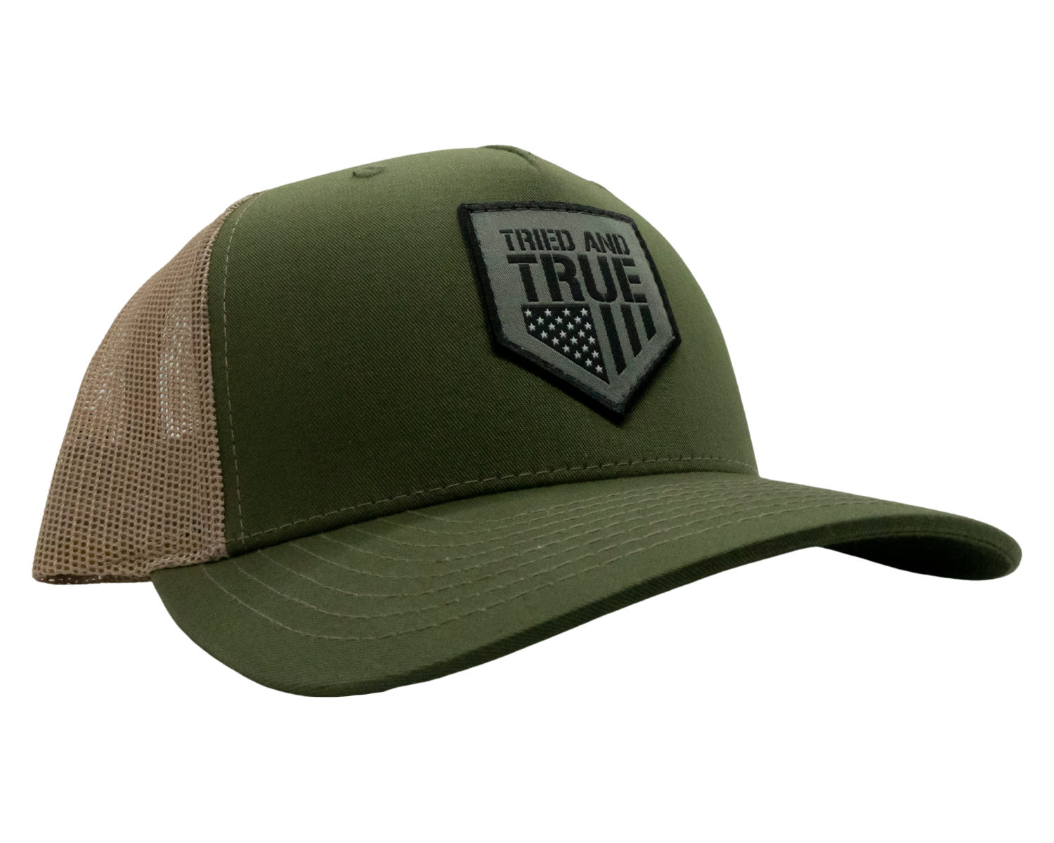 Shield Shaped Patch with words Tried and True and a partial American Flag