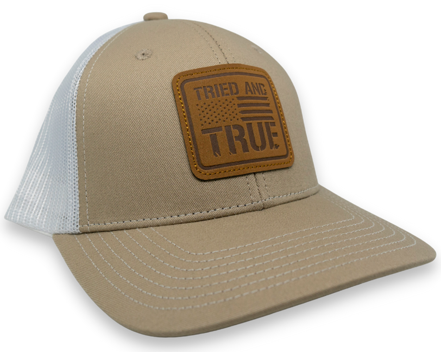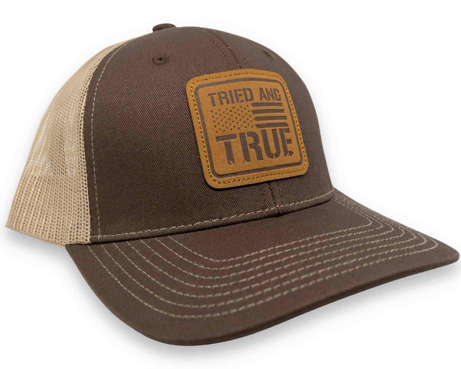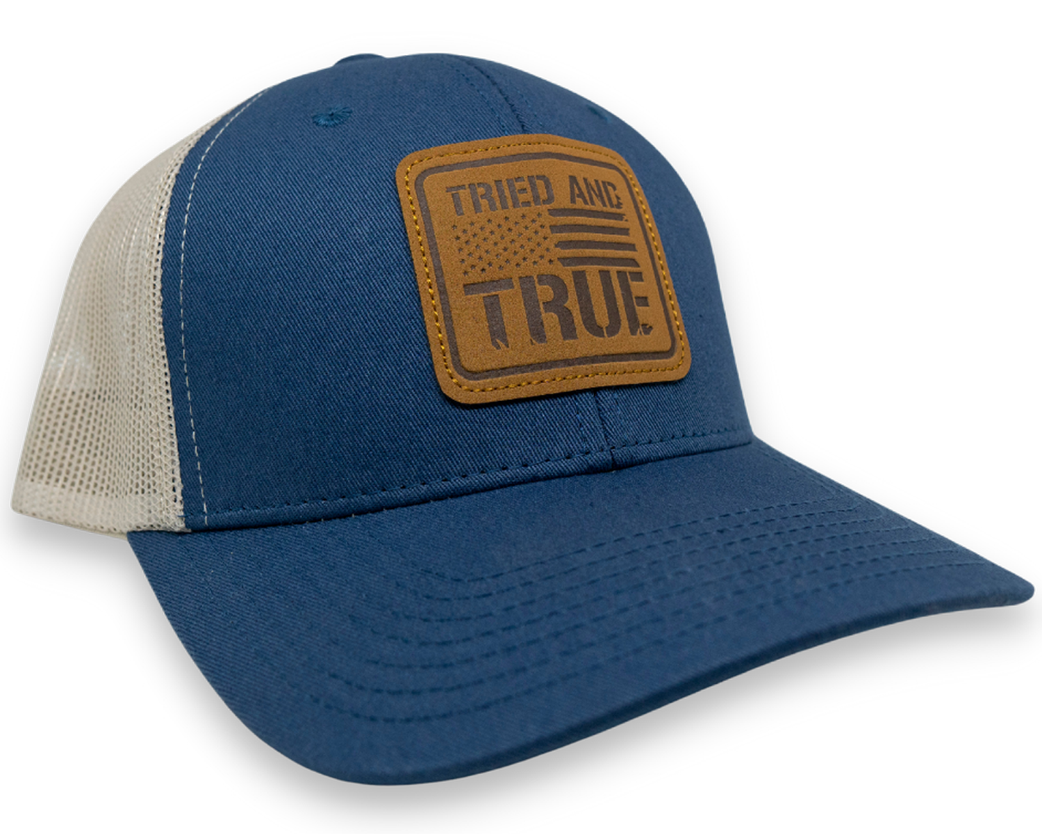 A leather square patch of the American Flag with "Tried and" outlining the top and "True" at the bottom.
