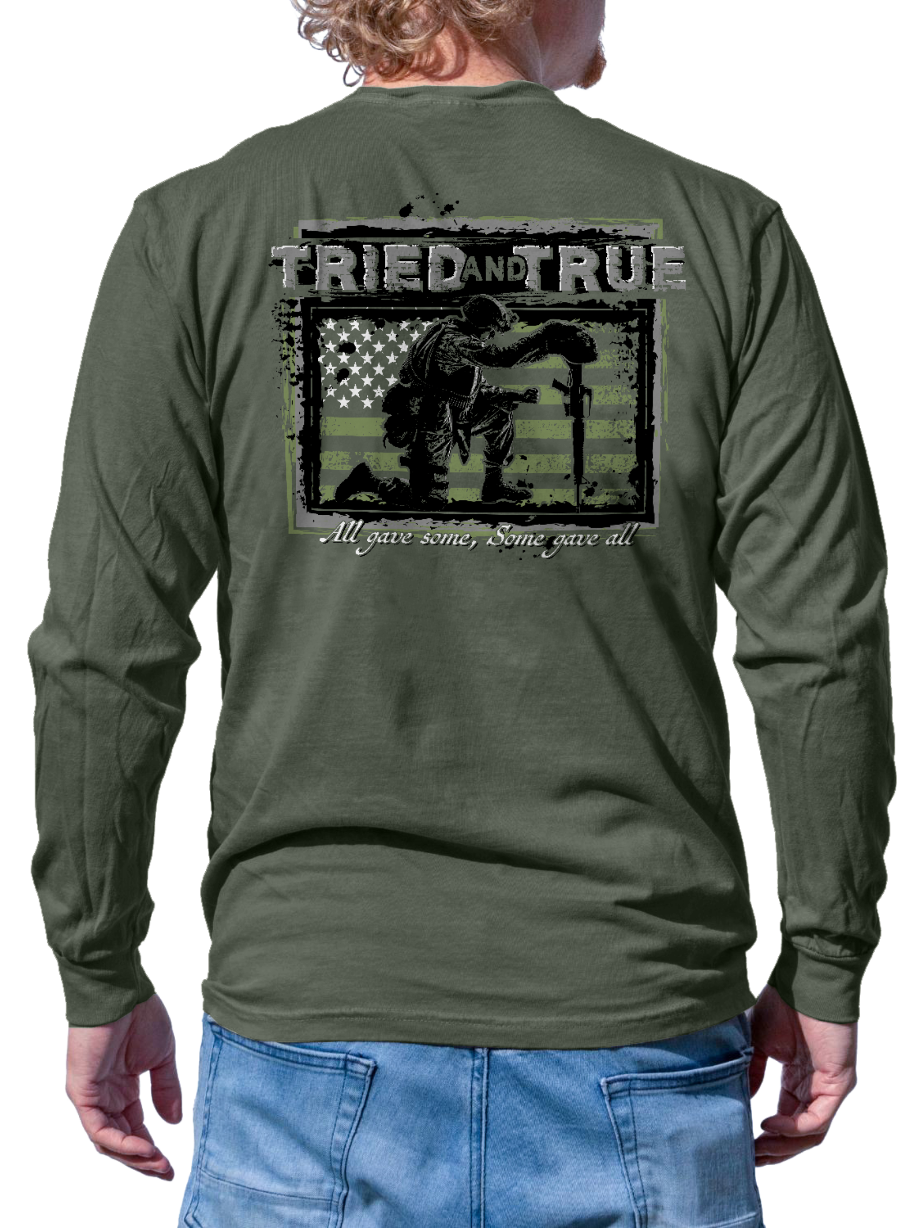 The Tried & True – Some Gave All tee is a fitting tribute to those heroes who sacrificed for all that we have today. This design from Tried and True features a kneeling soldier in front of an American flag, all screened on a super-soft tee made from durable, ring-spun cotton. For anyone who appreciates men's Americana clothing, this is a design that will never go out of style.