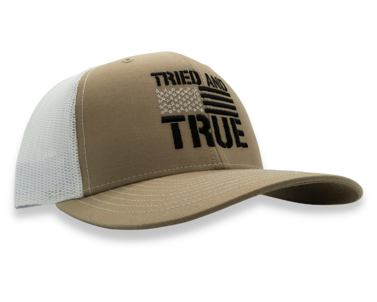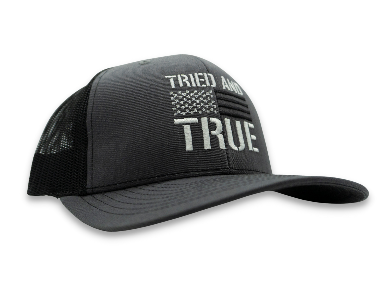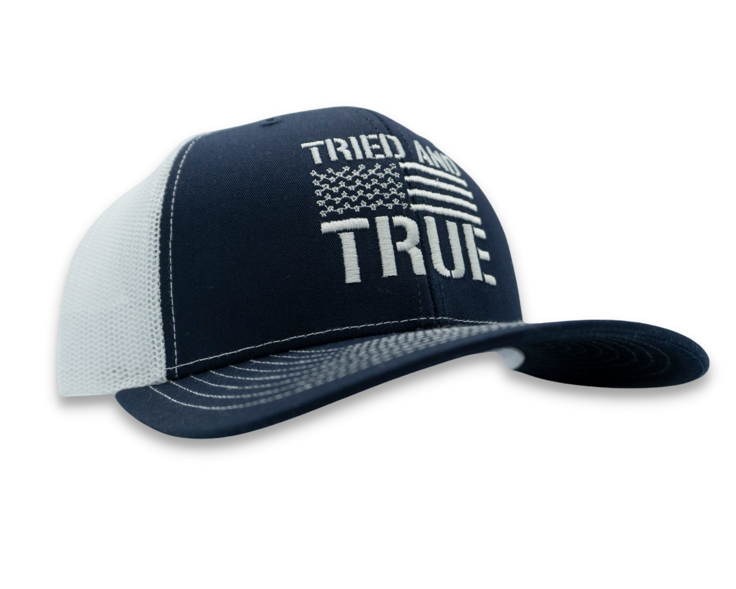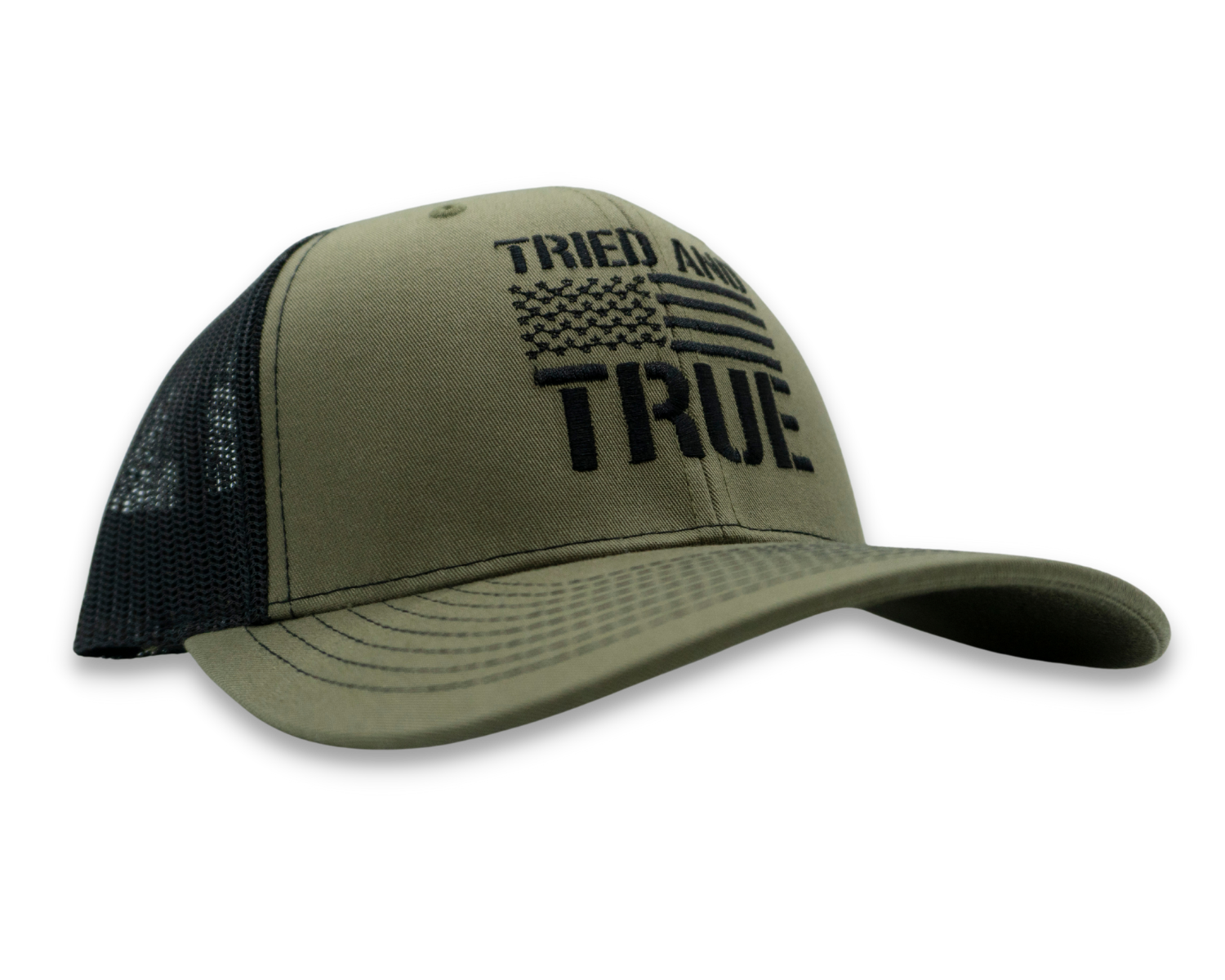Design: Embroidered American Flag Surrounded by the words Tried & True.