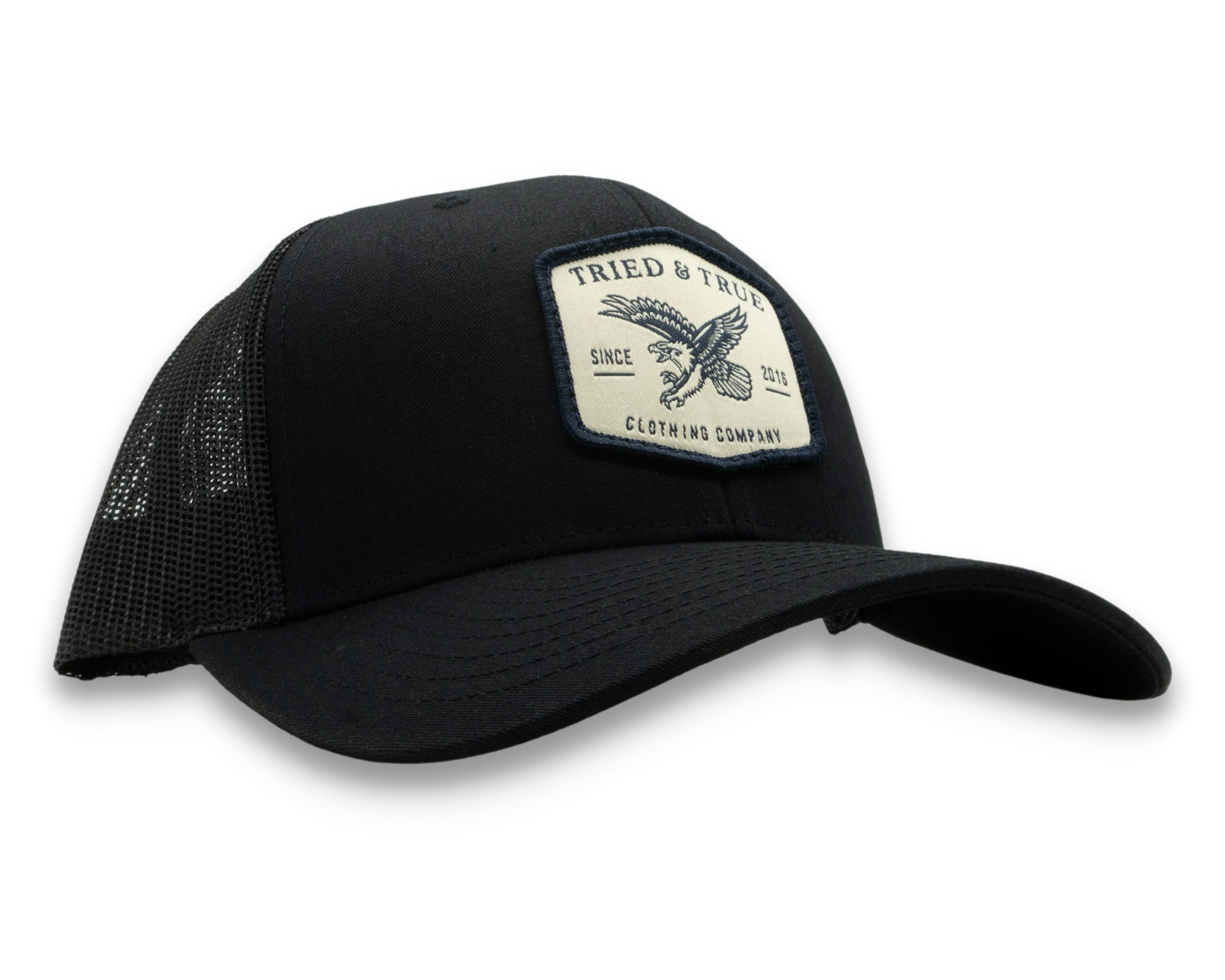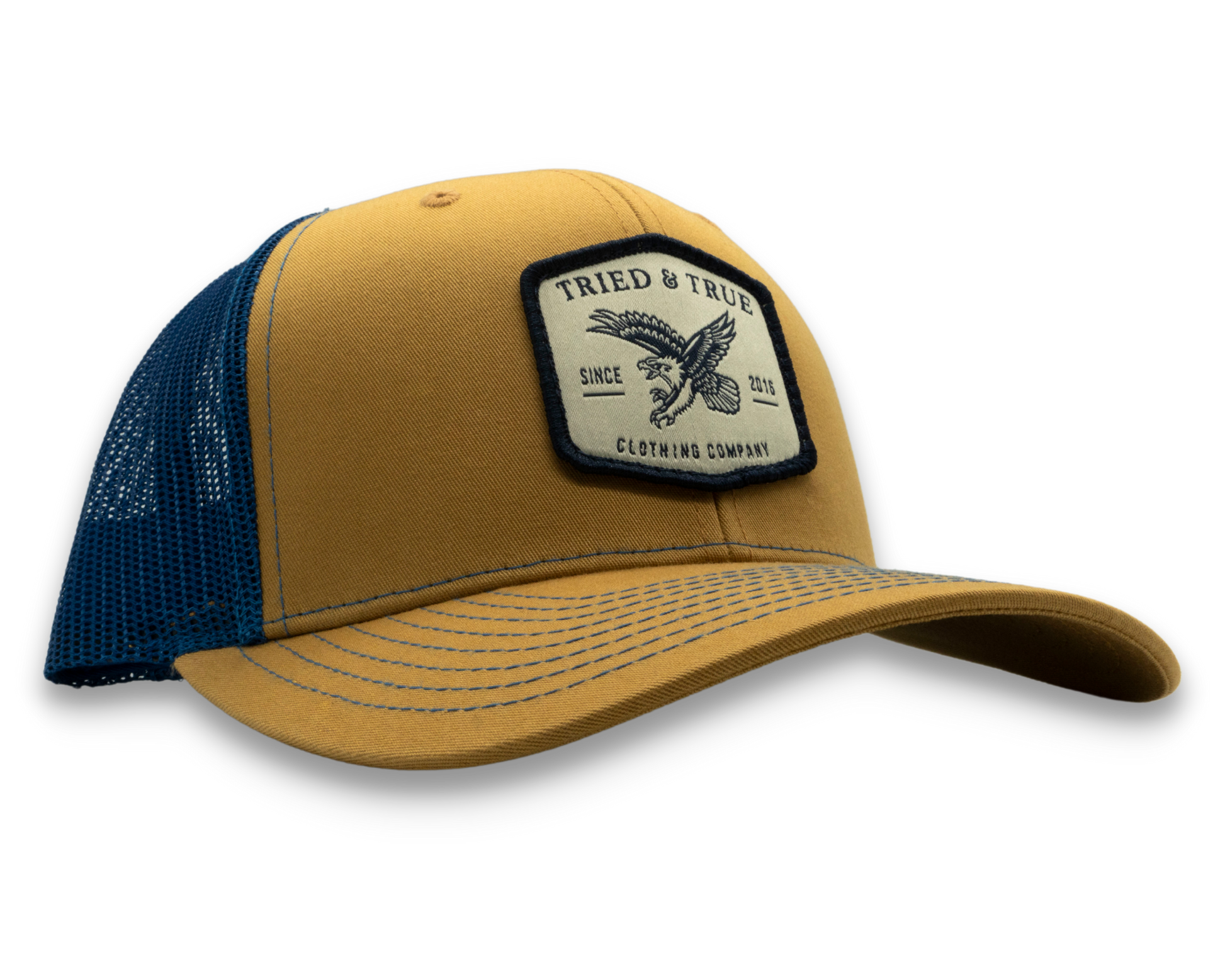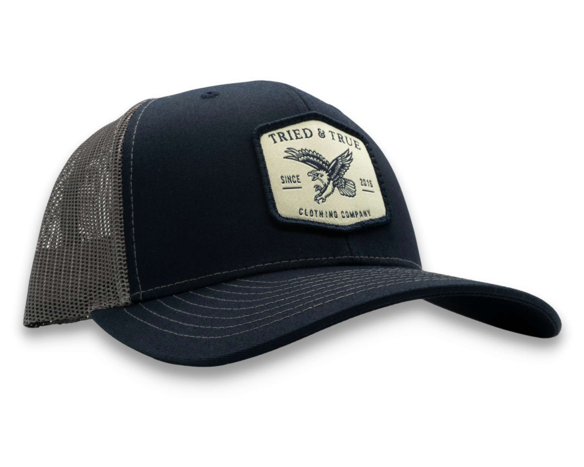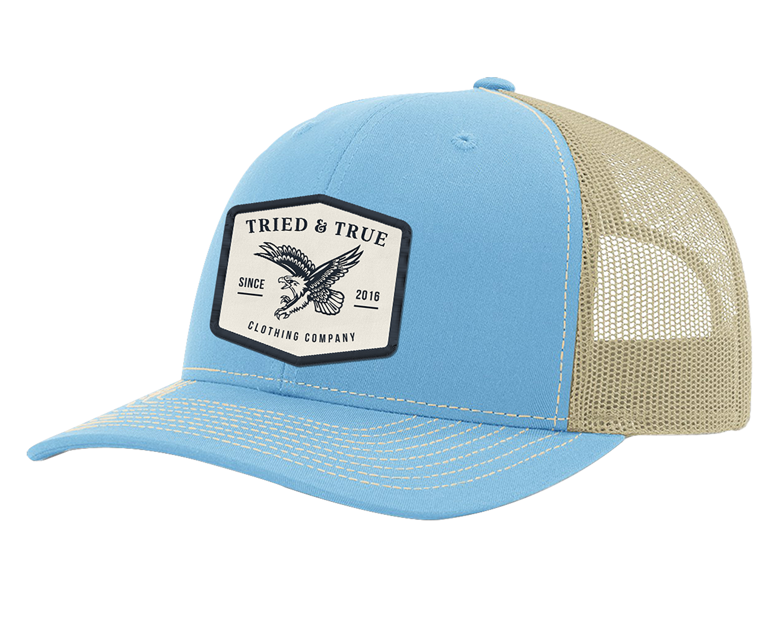 Design: Hexagonal patch with a flying eagle in navy on an ivory background.