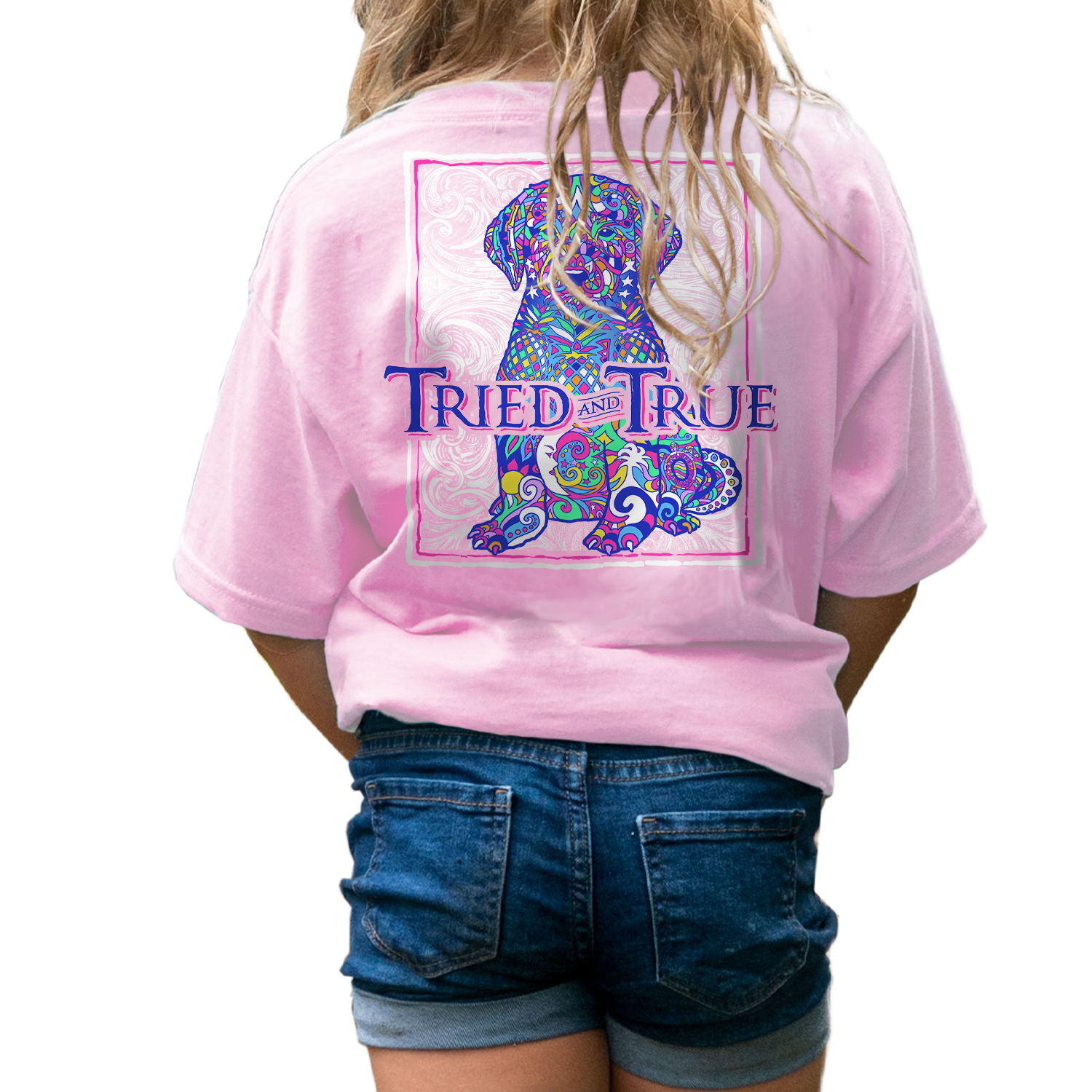 The cute mosaic puppy really pops with all its vibrant colors in front of a white Tried & True signature wave background.
