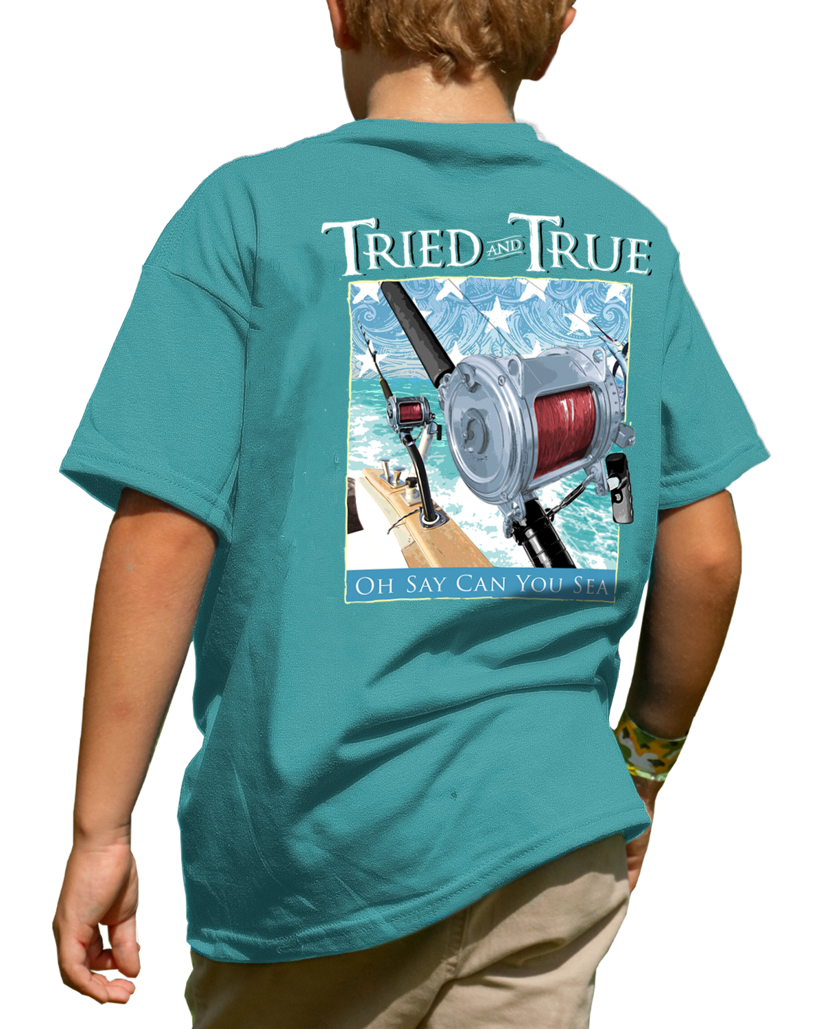 The shirt features fishing rods attached to the side of a boat on an open ocean. The words "Tried and True" are on top of the design.