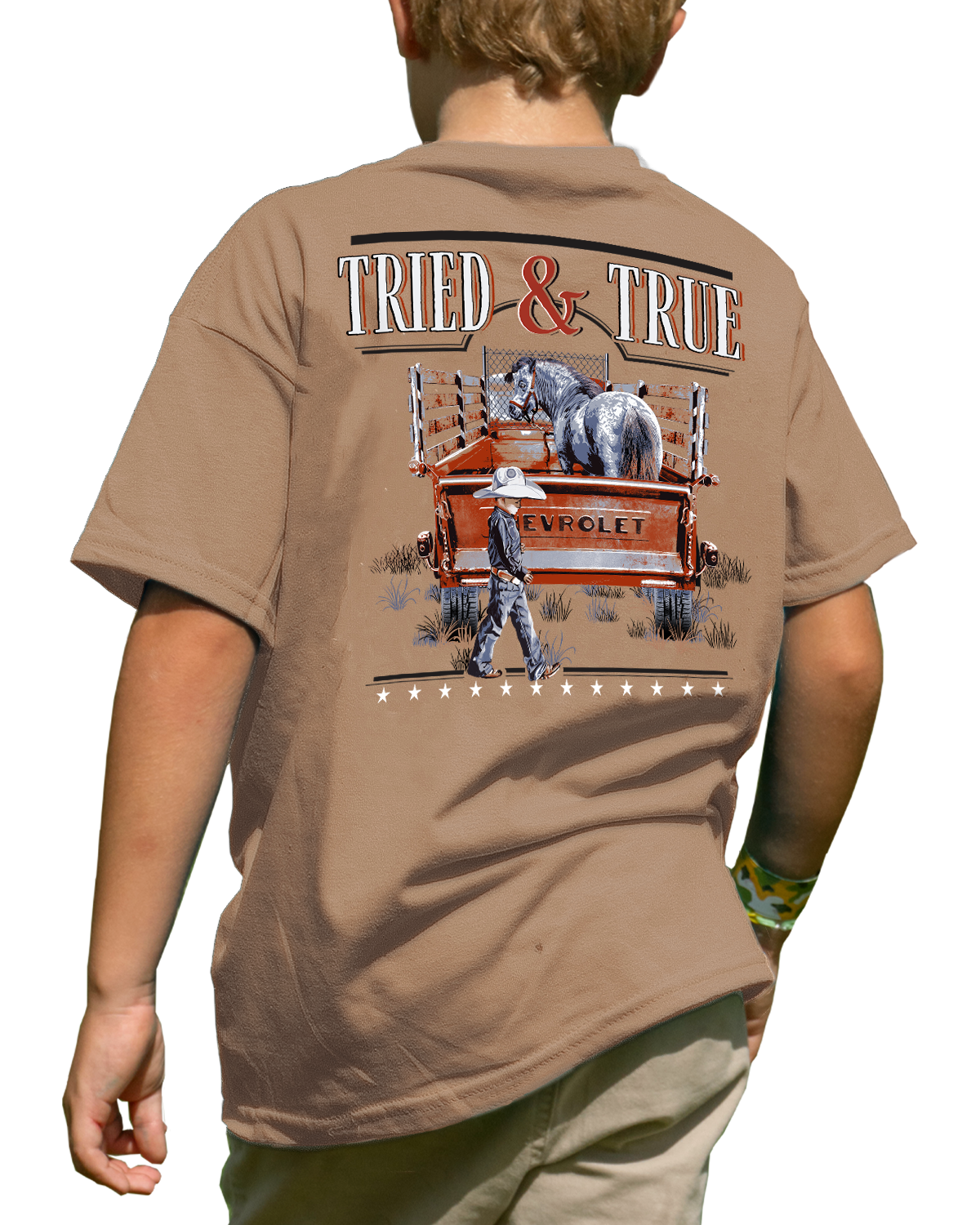 Rodeo and ranch ready, Our young cowboy strolls right in front of a pick up truck carrying his prize pony.